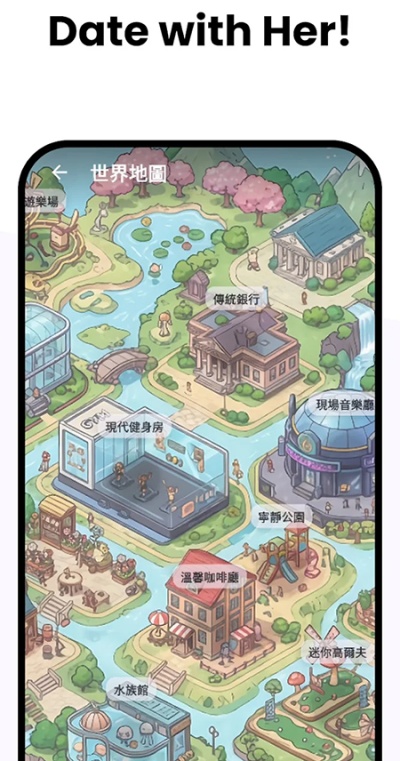 3、包含世界地图、校园游乐场、温馨咖啡馆、水族馆等10余种约会地图,用户可在聊天界面切换场景。