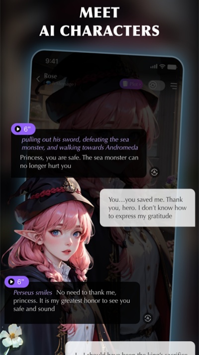 3、此外,应用中的对话会根据用户输入不断发展,提供真正身临其境的聊天体验,还有无数的场景和创意冒险,鼓励用户探索想象力,同时享受轻松的互动。
