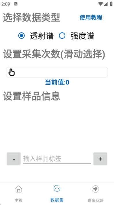 5:进入“数据集”板块,选择数据类型(如透射谱或强度谱),滑动设置采集次数,输入样品标签(如“水样1”),完善样品信息。