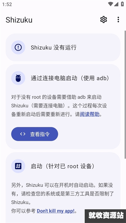 未 root 设备:遵照 Shizuku app 中的指引,通过 adb 启动服务。