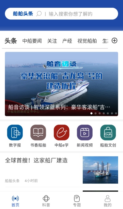 它设有多个精品频道和功能版块,其中 “头条” 频道汇聚船舶行业最新热点资讯,报道政策发布、重大项目签约等新闻。