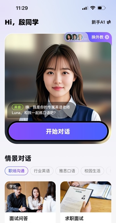 - 多形象任选:提供“甜美助教Luna”“职场导师Jessica”“阳光学长Lucas”“英伦专家Daniel”等多风格数字人,支持语音/视频双模式对话,口型与发音实时同步,搭配中英双语字幕,营造真实语言环境。
