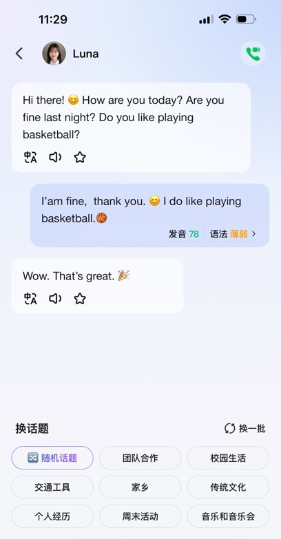 - 支持随机话题或特定话题,内置20+预设话题(校园科技、职业规划、国际传播等),满足日常交流与深度讨论;支持实时翻译、对话提示、换话题操作,降低开口门槛。