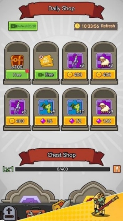 3、内置每日商店、宝箱商店和技能升级系统,提供道具更换和战力强化途径,丰富的游戏育成维度和可玩性。