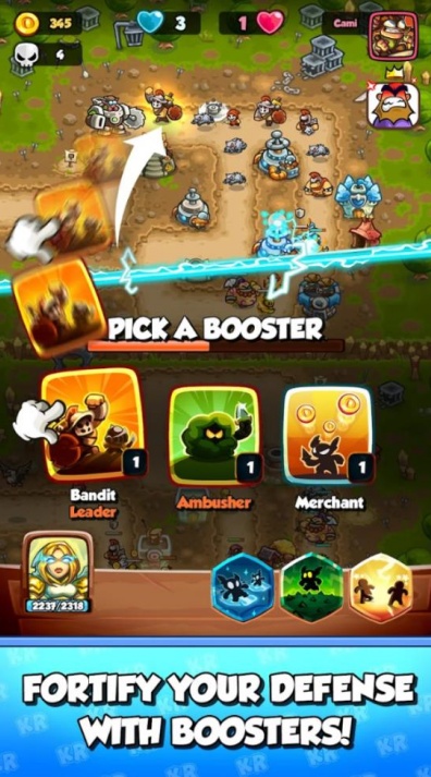 (KR Battles)激斗王国保卫战无敌版战前组卡(选防御塔、英雄、法术)→ 对战中用金币在黄圈建塔 / 升级→ 击杀敌人赚金