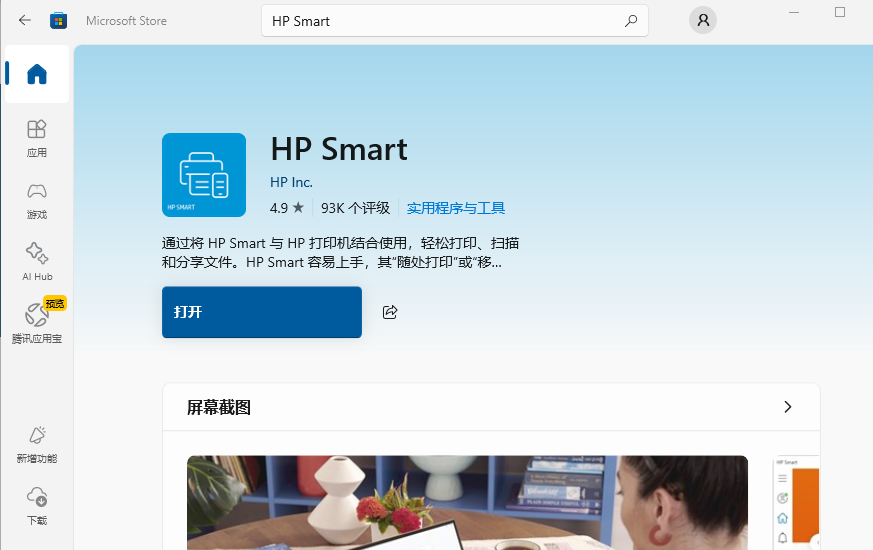 2、由于我已经安装过了,点击上图中的打开Hp Smart即可。