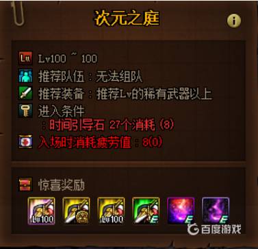 首先次元之庭是史诗之路活动的专属副本,在这副本中玩家可以有大概率获得史诗和神话装备,其次玩家在入场时需要消耗27个时间引导石和8点疲劳值。